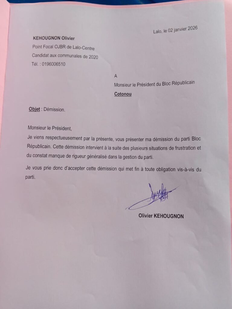 Le Bloc Républicain (BR) vient d’essuyer un coup dur au cœur même de Lalo-Centre. Cette fois, il ne s’agit ni d’une rumeur de couloir ni d’un simple malaise interne. Olivier KEHOUGNON, Point focal de l’OJBR de Lalo-Centre et ancien candidat aux élections communales de 2020, a officiellement démissionné du parti.